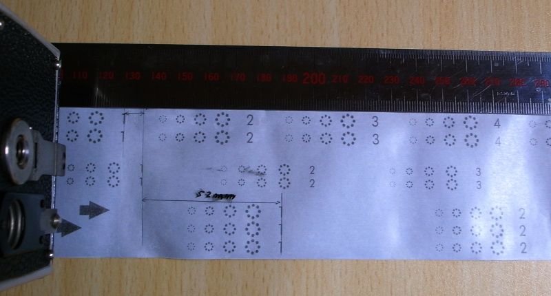 赤窓使って設定すると12枚撮れない問題は下の写真を見れば分かります。現代のフィルムには写真下から6×9、6×6、6×4.5の3つのガイドナンバーが書かれています。これを、standardの裏底と合わせると、赤窓で見みている数字は6x9mmのガイドナンバーなのです。真ん中の6×6のガイドナンバーとの差は52mmもあります。なので、6x9mmの数字に合わせると52mmもフィルムが進んでしまい、最後のコマがフィルムの端になって、切れてしまうのです。なので、現代のフィルムではこの赤窓は使えません。