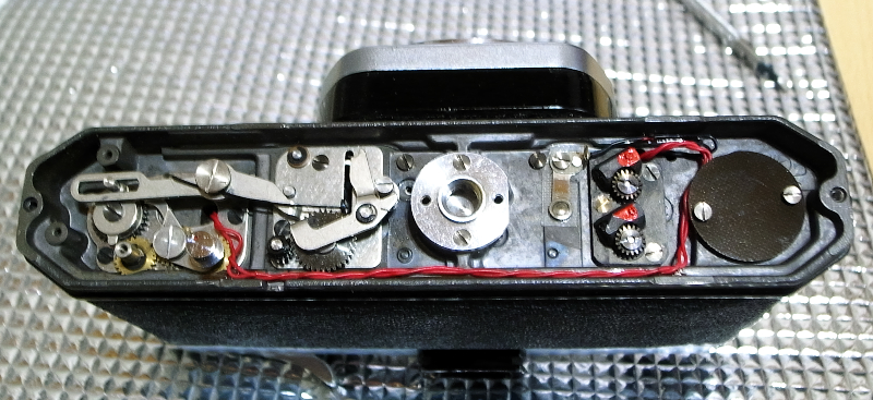 次に、露出計の確認をしてみた。LR44でも使えるというのを見たので、LR43やってみたがやはりだめだった。LR44が使えるのはSP Fという後期の機種みたい。しかし、バッテリーチェックは動かなかったが、どうにかメータが動いていたので、動く可能性も出てきた。ただし、逆方向に。SP Fとは電池の入れ方が逆なのか?電池が届いてからに。
