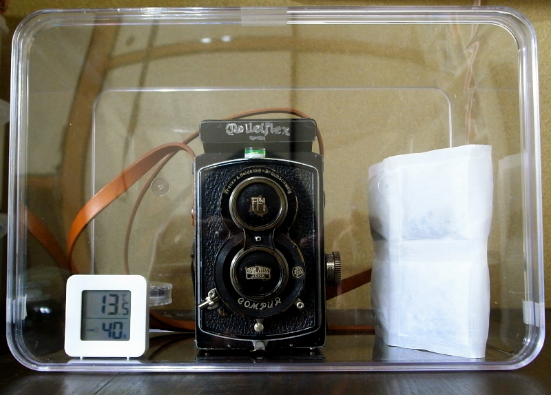 投稿日: 2026-02-192026-02-19 投稿者: takesakoRollei Standardをオブジェに ダイソーの透明ボックスに入れてみました。防湿剤の見栄えを考えないといけないけど、それなりの気密性はあるような感じです。底を削った水準器は水が抜けてしまい、前面にゴムで付けることに。