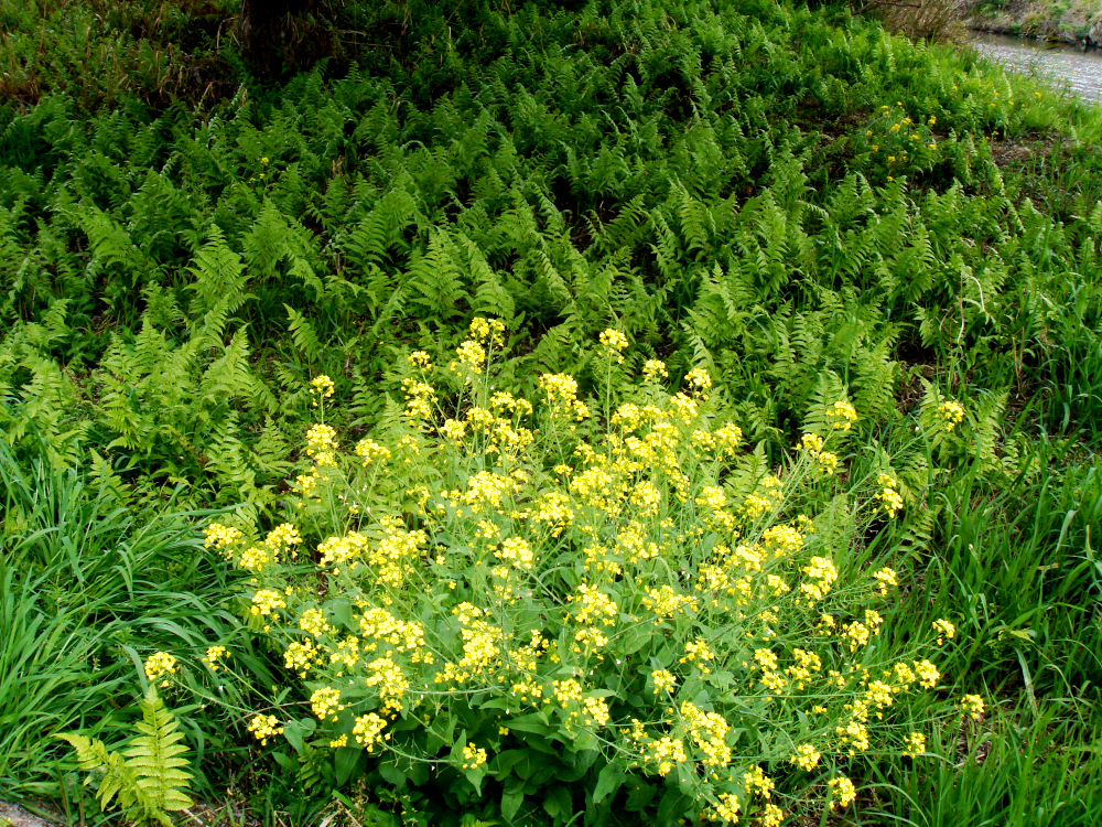 菜の花の黄色と、シダの新緑もきれいです。