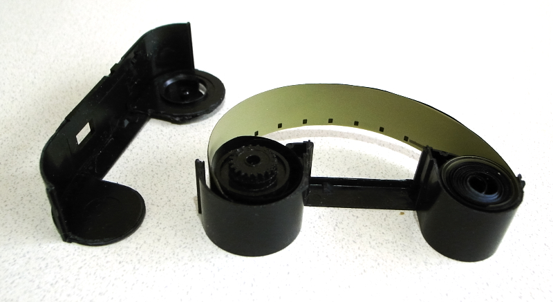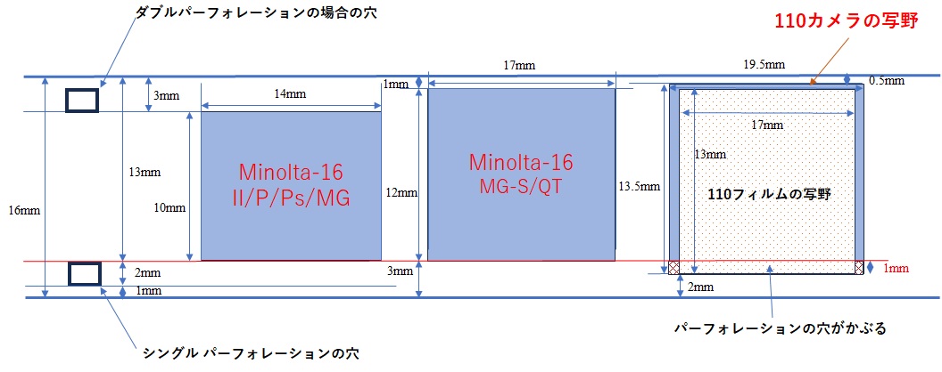 これを使えば、細工すること無しに、110カメラがそのまま使えることになる。ただし、フィルムは120フィルムからの切り出しなど、無欠のフィルムが必要。市場には、16mmのパーフォレーションの無いフィルムは無いようだ。110カメラの画角は、上のような片穴のフィルムでも、穴に画面がかかってしまうため、110カメラの画角全域を使おうとすると、無穴のフィルムが必要だ。