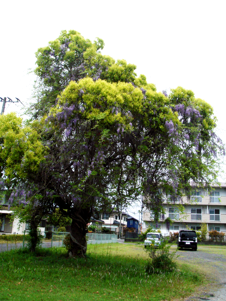大木にまとわりついた藤の花が咲いてます