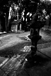 子之神社の道祖神 神明社の石段を下りて左に折れて、子之神社へ。日が当らないので低速で切る。ここの道祖神は焼けれていないらしく、まだ端整な姿をしている。あたまには帽子をかぶってるようだ。 | ![]() |