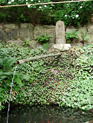 鍛治橋を渡り川と平行の小道を進むと、川には大きな鯉が泳いでました。鍛治橋から200mぐらい先を右に折れて、「老婆鍛治山不動尊・霊泉の滝」を目指ます。100mぐらい行くと右側に小さな池があり、竹筒で水が落ちていました。看板に「霊泉の滝」の案内あり。池の上にはちょうどアジサイがさいていて、その中にお不動さんが置かれていました。滝の右の急な階段を登ると小さな社があり、庭には力石とドンと焼きに使うと思う丸石が置かれてました。 | |