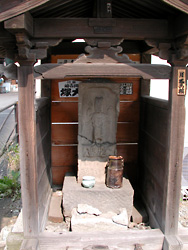 反町庚申塔(14:49) さらに道なりに500mぐらい進むと溝口の駅前にでました。駅の入り口にある反町の交差点に「反町庚申塔」と呼ばれる庚申塔がありました。排気ガスのせいかちょっと痛み気味の像でした。この庚申塔は道標を兼ねていて、「西大山道 東江戸道 南加奈川道」と刻まれているそうです。 |