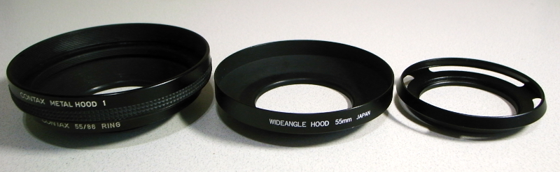 28mmのレンズまで使えるという、55口径用の穴開きフードを買ってみた。55mm用の広角フードとしては、市販の真ん中のフードを持っているが、これは35mmのレンズまで。コンタックスの標準では左のようにm55/86mm変換リングを付けてHOOD1を付ける指定になっている。しかし、これは大げさ過ぎるので、変換リングだけ使っていた。