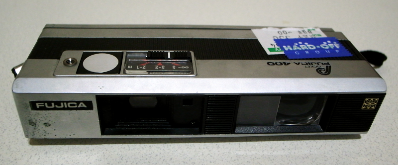 最初に、穴のないフィルムで試験した所、Fujica 350はフィルム巻き上げがどこまでもできる状態で、シャッターも押せず。Kodak Ektralite 400は、一回の巻き上げで止まるが、やはりシャッターは押せず。両機は、これまで扱った110機種(Rollie 110やOptima500)と違い、パーフォレーションの穴をシャッターチャージにも使っていた。
