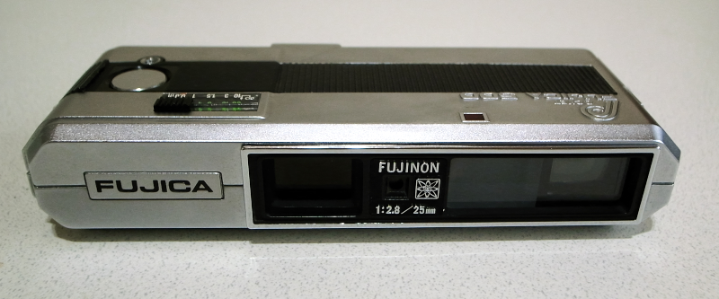 縦型の110機としては後期のFujica 550が届いた。レンズは20mmF4のテッサータイプ(35mm換算で40mmぐらい)。目測式の距離計でピント調整。露出はF4・1/125s(EV11@ISO100)~F16・1/250s(EV16)の電子シャッター。ただ、最低がEV11なので、曇の日ぐらいまでとなる。単3電池2本を入れて確認すると、暗い場所では赤ランプでシャッターは押せない。ただ、単3なので重量は重く(263g)なる。向かって右下のレバーでレンズのカバーをすることで電気系統のSWが切れる仕組みになっているらしい。